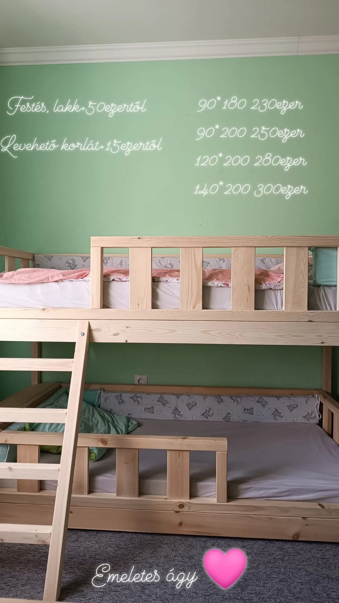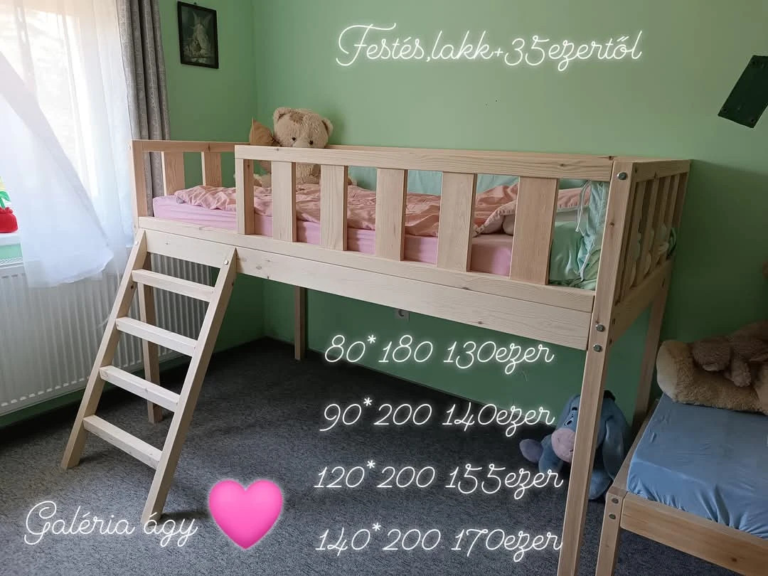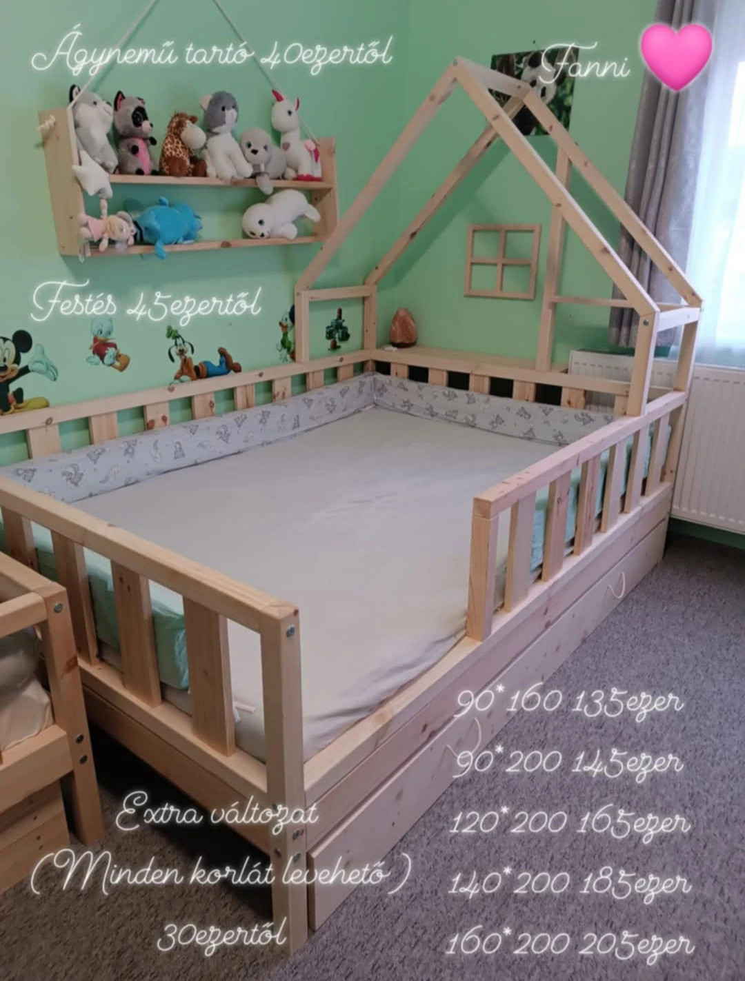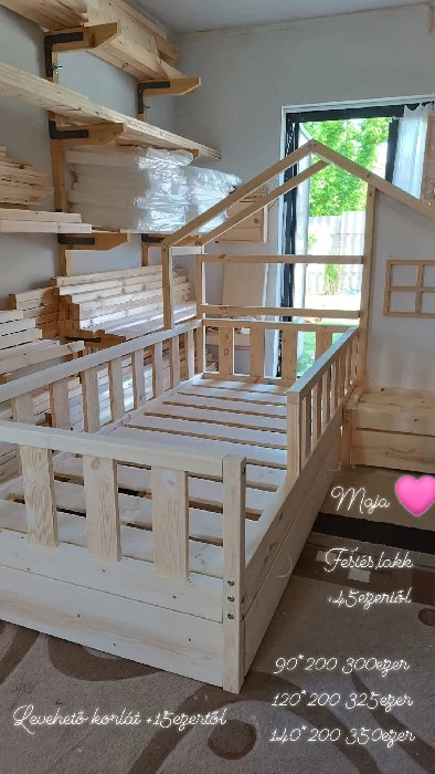 Felár: ágynemű tartó, levehető korlát,közèpső bejárat,vendèg ágy,festès,magasabb láb, magasabb korlát, egyedi mèret,kis ajtó, oldalsó takaró fa, szerelès, szállítás.